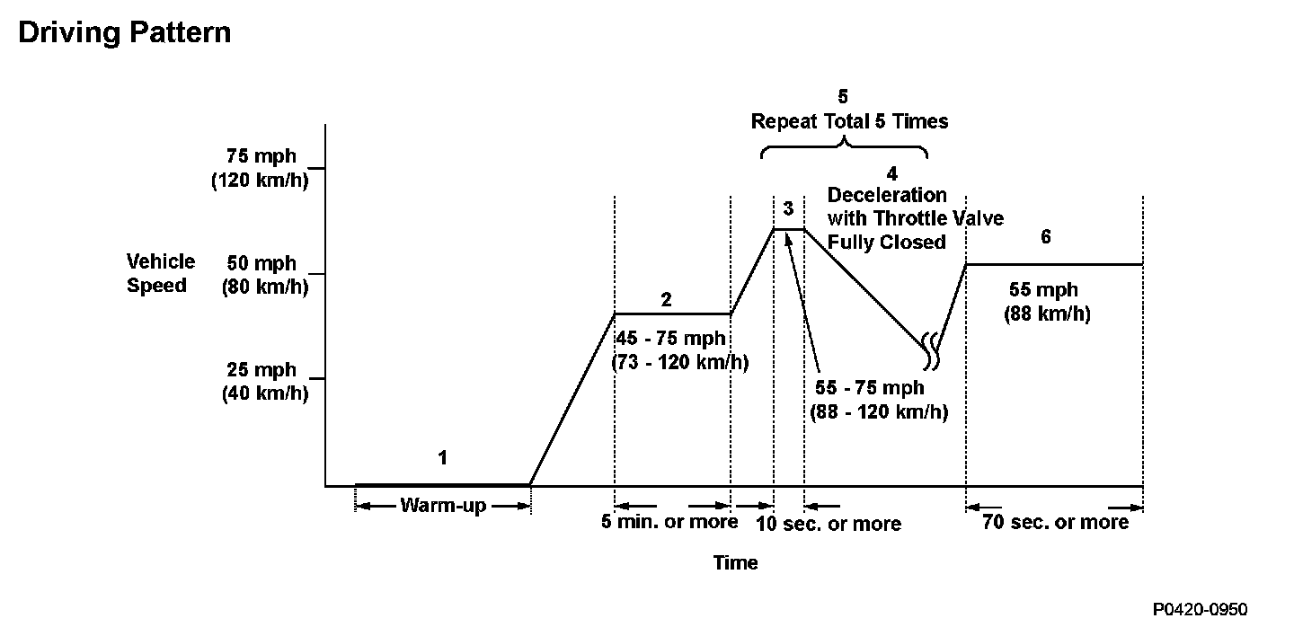 2. Drive the vehicle at a speed between 45 - 75 mph (73 - 120 km/h) for at least 5 minutes, to warm up the TWC.