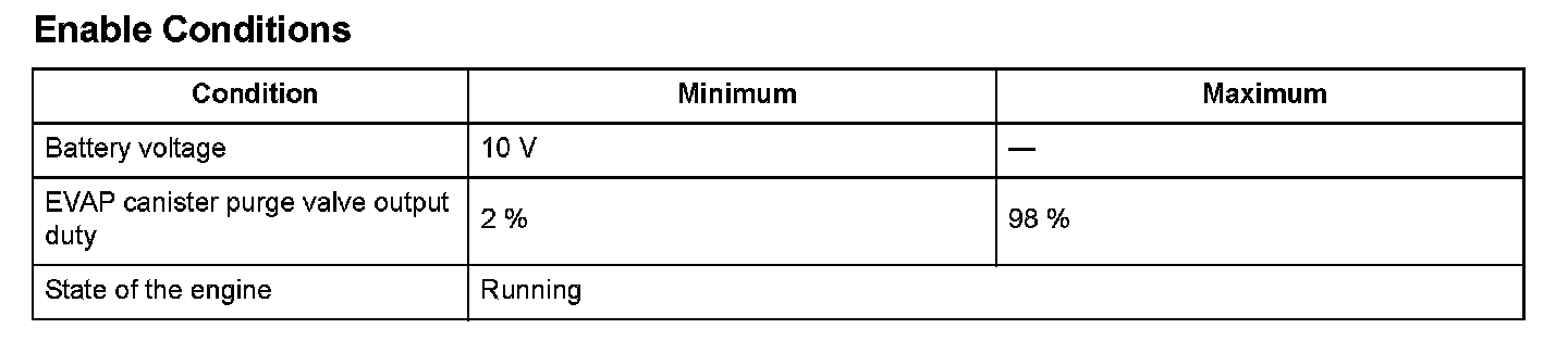 The evaporative emission (EVAP) canister purge valve is attached to the vacuum port between the EVAP canister and the intake manifold. The powertrain control module (PCM) does not turn on the EVAP canister purge valve when the engine coolant temperature is 140 °F (60 °C) or less. The PCM adjusts the amount of fuel vapor sent to the engine by controlling the EVAP canister purge valve duty cycle. When the return signal does not change according to the EVAP canister purge valve duty cycle for a set time, the PCM detects a malfunction, and a DTC is stored.