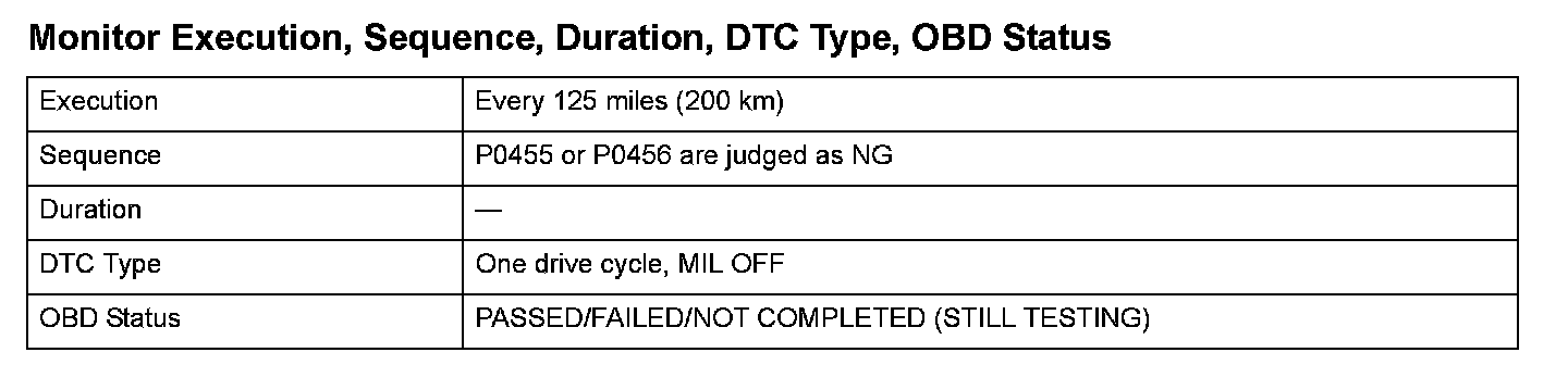 Monitor Execution, Sequence, Duration, DTC Type, OBD Status