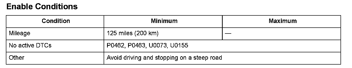 Drive for the specified mileage under Enable Conditions without refueling (turning the ignition switch to LOCK (0) is acceptable).
