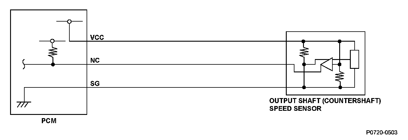 The output shaft (countershaft) speed sensor is attached to the outside of the transmission housing. The output shaft (countershaft) speed sensor generates a pulsing signal according to the speed of the park gear on the output shaft (countershaft). Using that signal, the powertrain control module (PCM) determines the speed of the output shaft (countershaft). If pulse dropouts occur with the output shaft (countershaft) rotating, the PCM detects a malfunction that may be caused by an open, a temporary open, or a short to ground. Based on the velocity ratio measured by the input shaft (mainshaft) speed sensor and the output shaft (countershaft) speed sensor, a malfunction is detected and a DTC is stored.