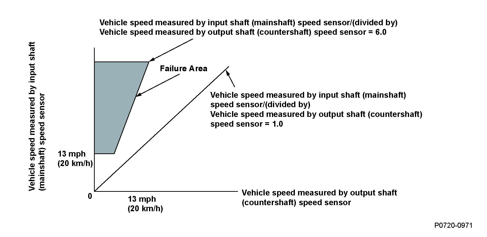The ratio of the vehicle speed measured by the input shaft (mainshaft) speed sensor/(divided by) the vehicle speed measured by the output shaft (countershaft) speed sensor is greater than 6.0 for at least 10 seconds.