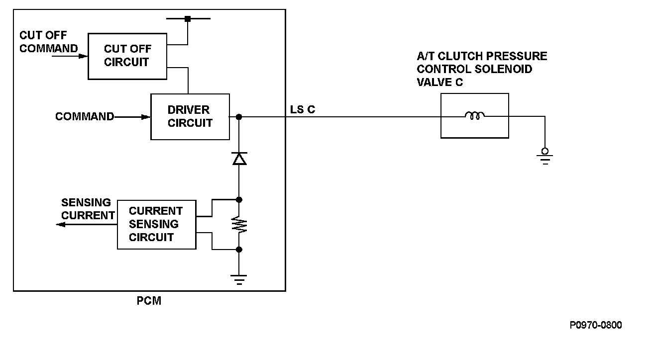 A/T clutch pressure control solenoid valve C is used for the clutch pressure control and the lock-up control. A spool in A/T clutch pressure control solenoid valve C pushes a valve according to the duty cycle that is controlled by the powertrain control module (PCM) so the hydraulic pressure is proportional to the current. The PCM measures the current flowing through A/ T clutch pressure control solenoid valve C and uses feedback control to compensate for the difference between the actual current and the commanded one. If the measured current for the PCM output duty cycle is not within a specified range (open or short), a malfunction is detected and a DTC is stored.