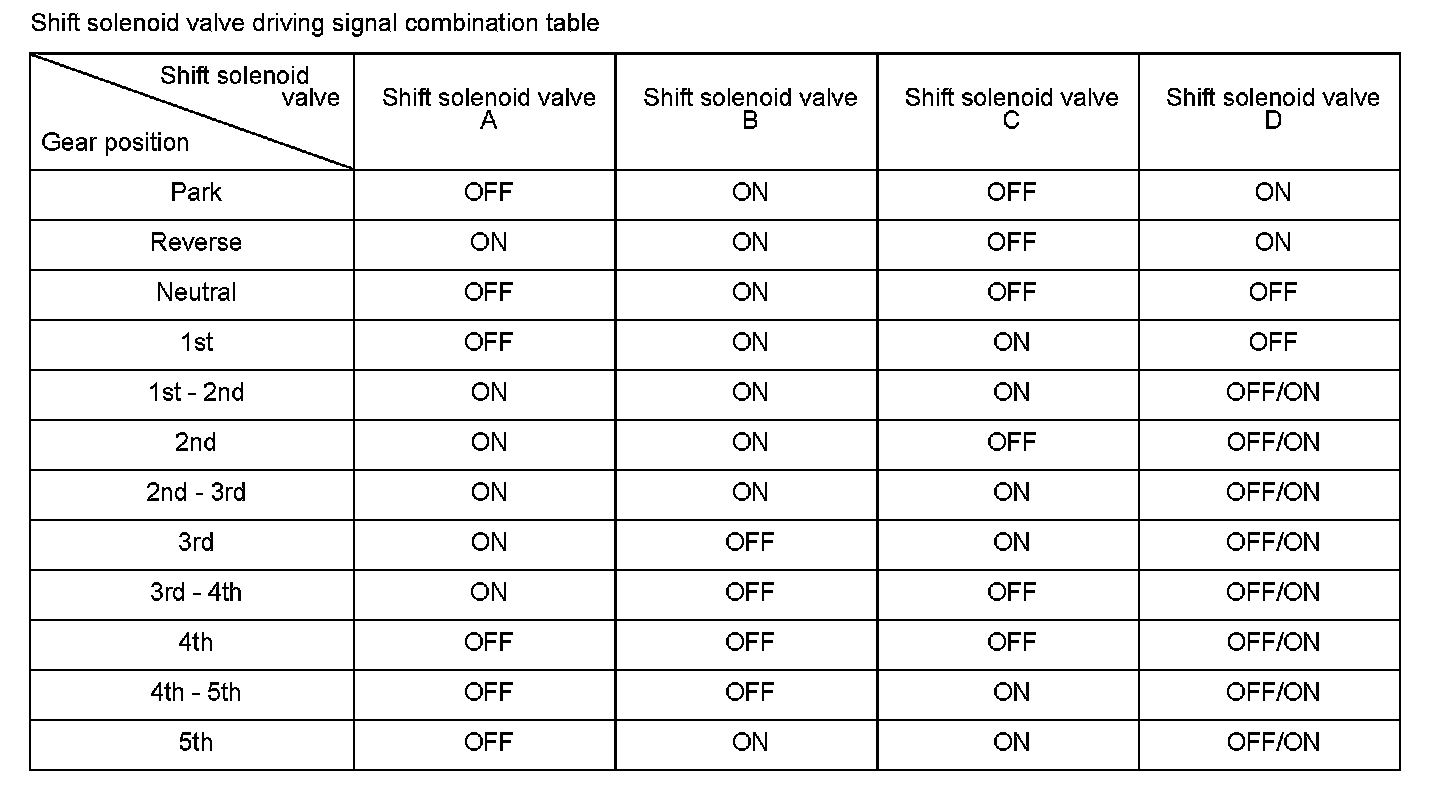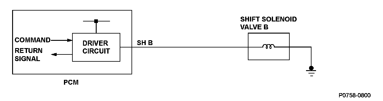 When shift solenoid valves A and D are turned ON, or when shift solenoid valves B and C are turned OFF, the hydraulic pressure circuit opens. The hydraulic pressure circuit supplies/discharges hydraulic pressure to/from each clutch according to the combination of the ON/OFF status of those valves and the shift valves. The powertrain control module (PCM) commands the driver circuit to turn on the shift solenoid valve. The circuit diagnoses malfunctions such as a circuit short or open, and sends back a return signal during the PCM's command. A malfunction is detected when the return signal does not match the PCM command to turn OFF the shift solenoid valve, and a DTC is stored.