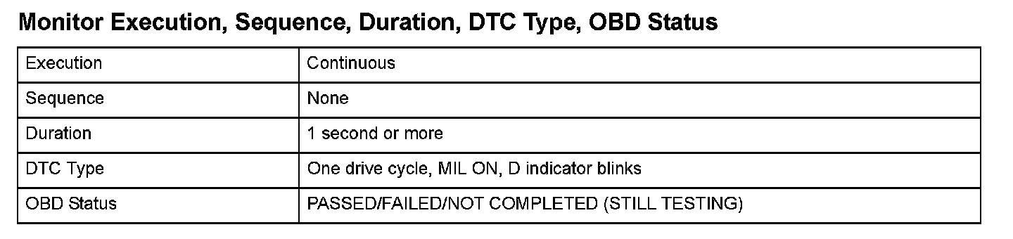 Monitor Execution, Sequence, Duration, DTC Type, OBD Status