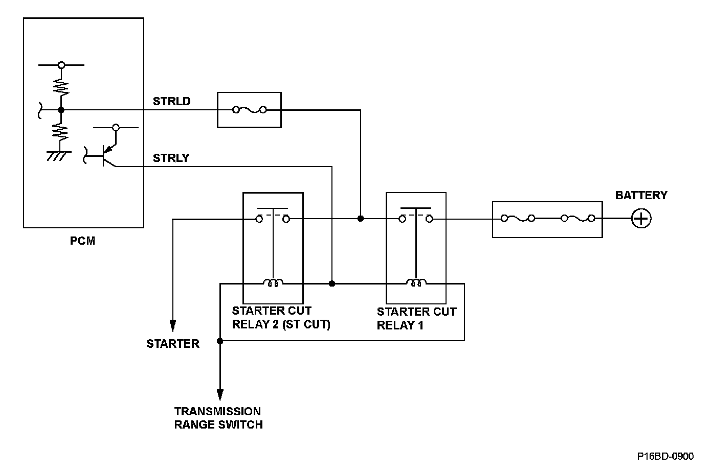 To prevent the starter from continuing to run due to a switching failure of the starter cut relay, two starter cut relays are connected in series. When the input voltage of the STRLD terminal drops to a set voltage even when the starter cut relay output (STRLY) is turned off, the powertrain control module (PCM) detects a malfunction of starter cut relay 2 and a DTC is stored.