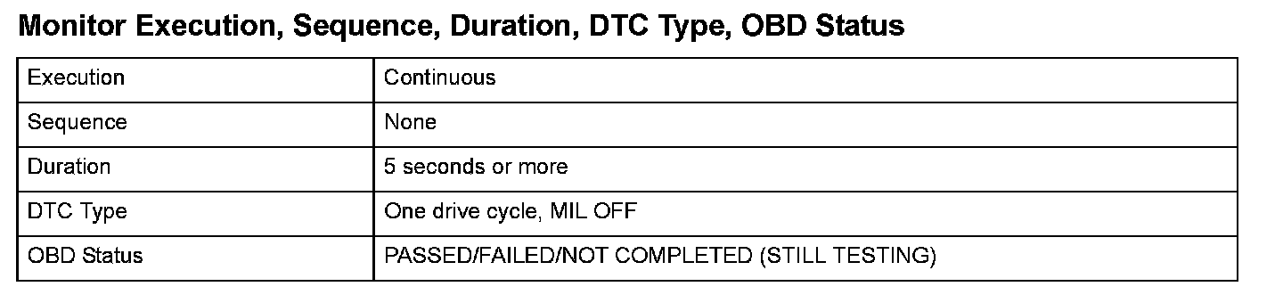 Monitor Execution, Sequence, Duration, DTC Type, OBD Status