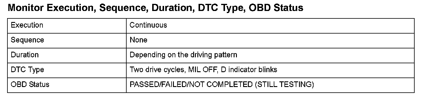 Monitor Execution, Sequence, Duration, DTC Type, OBD Status