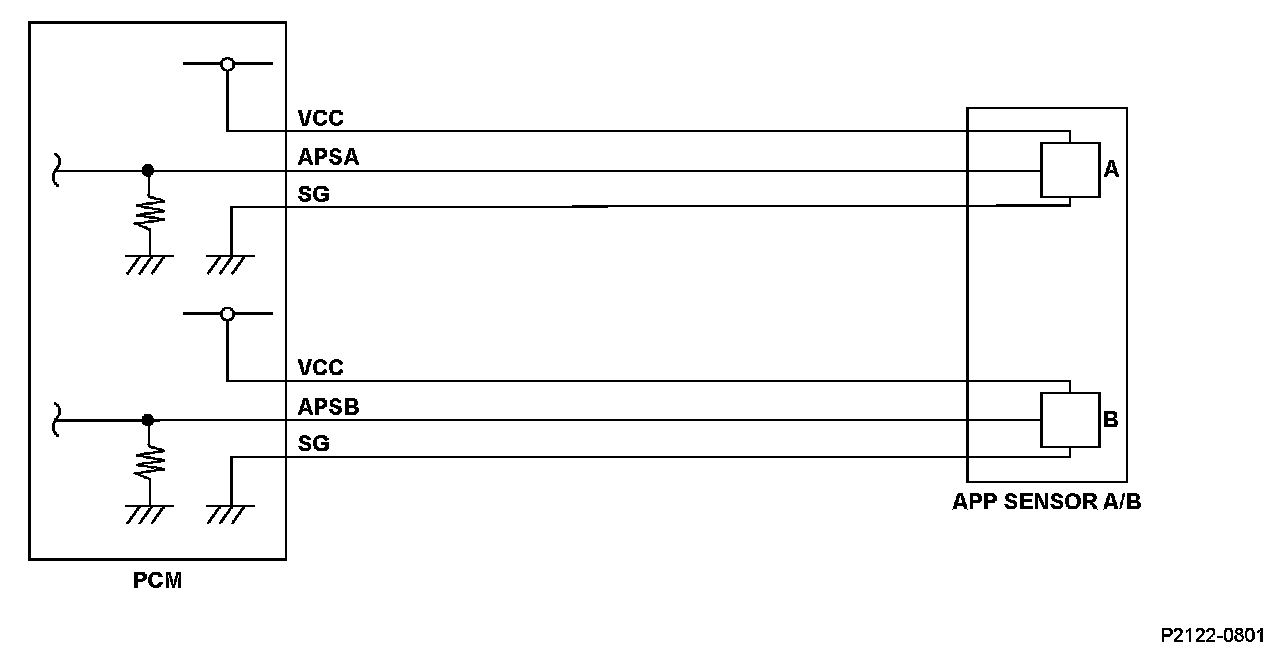 Accelerator pedal position (APP) sensor A is a part of the electronic throttle control system (ETCS), and it is used to convert the position of the accelerator pedal into electrical signals. Based on these signals, the powertrain control module (PCM) controls the throttle actuator so that the throttle position agrees with the accelerator pedal position. If the signal voltage from APP sensor A is a set value or more, the PCM detects a malfunction and stores a DTC.