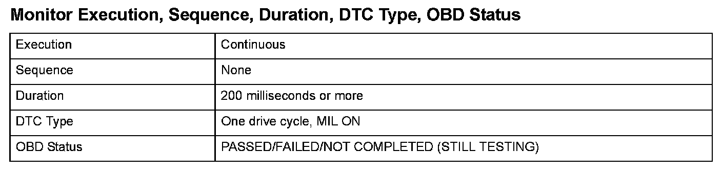 Monitor Execution, Sequence, Duration, DTC Type, OBD Status
