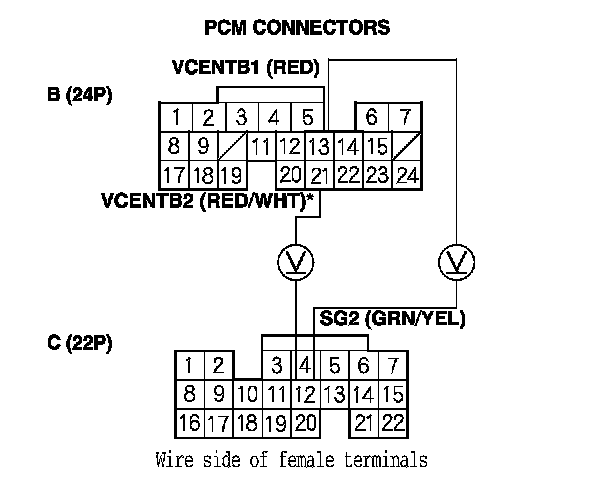 13. Measure the voltage between PCM connector terminals B13 (B21)* and C12.