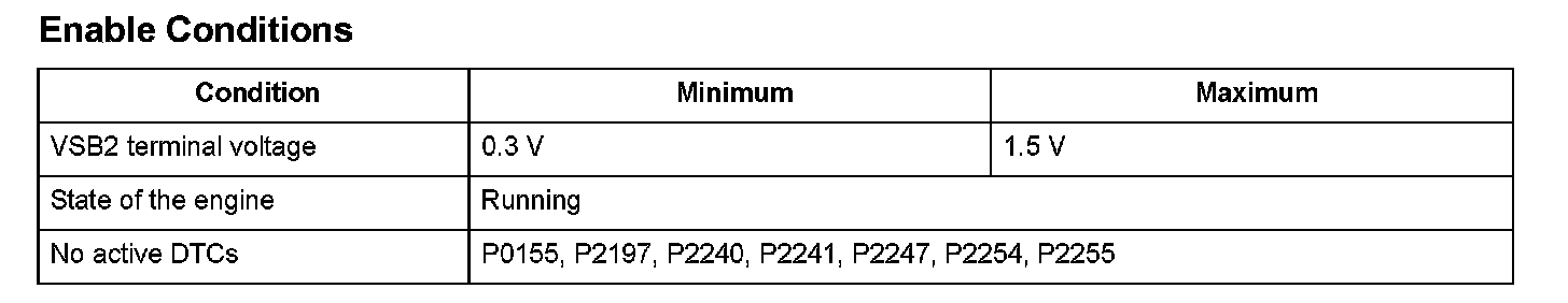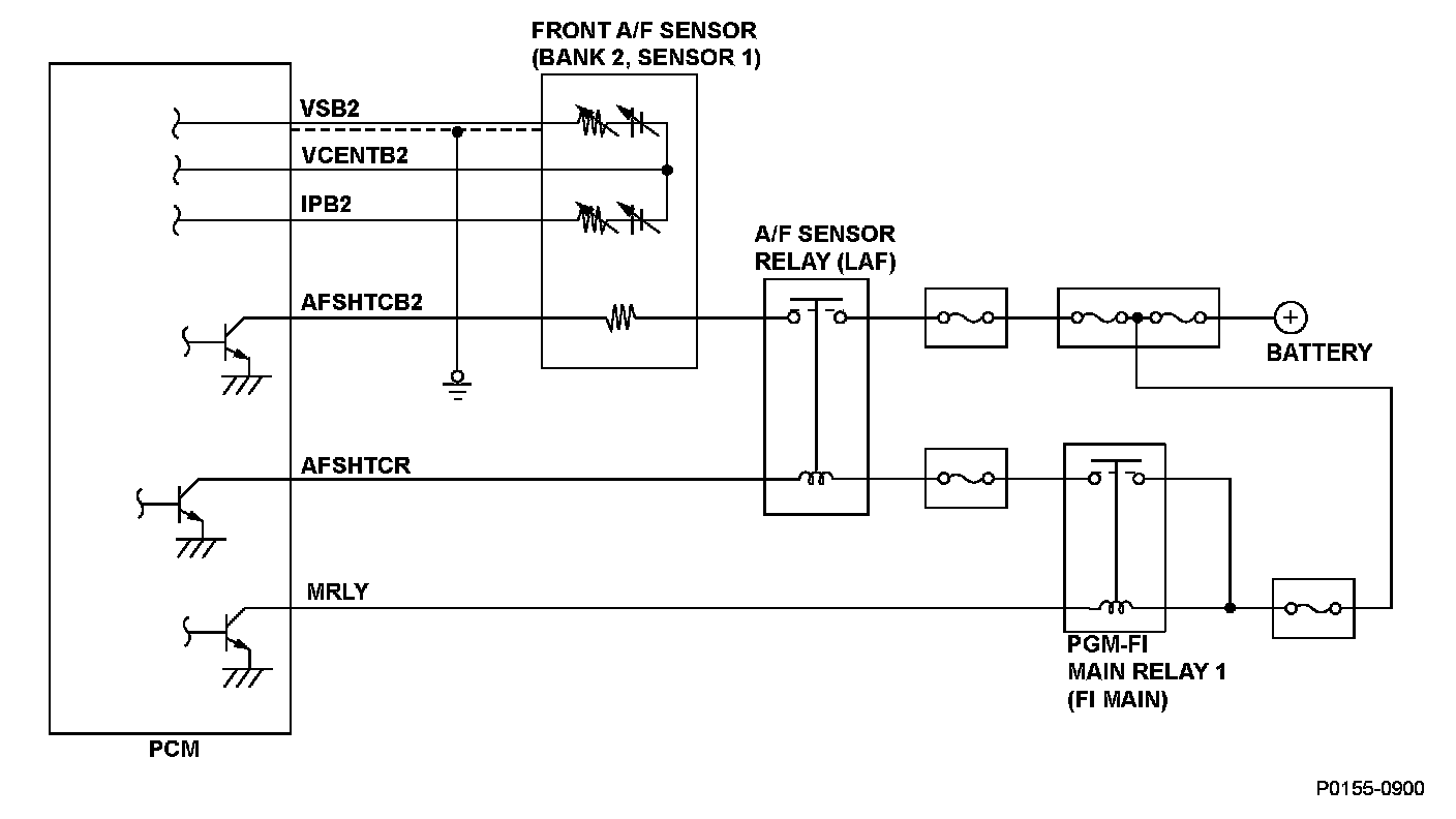The front air/fuel ratio (A/F) sensor (bank 2, sensor 1) is installed in the exhaust manifold and detects oxygen content in the exhaust gas. The front A/F sensor transmits a signal to the powertrain control module (PCM). The PCM controls fuel injection duration by comparing the target air/fuel ratio with the front A/F sensor signal. The sensor includes the VS cell, the pump cell, the atmospheric reference cavity, the diffusion layer, and the heater, and it enables overall feedback control. If the IPB2 terminal voltage is a specified value or more, and the VCENTB2 terminal voltage is less than the specified value, the PCM detects a malfunction and stores a DTC.