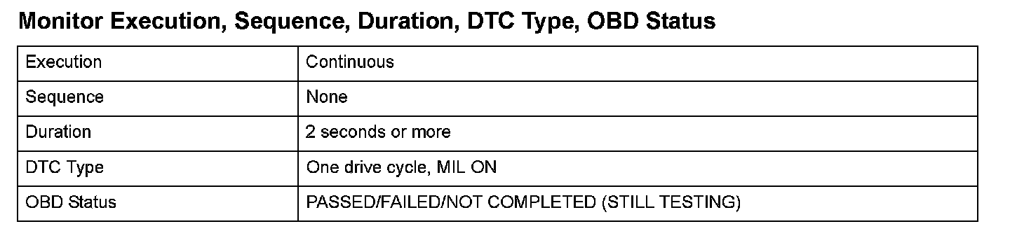 Monitor Execution, Sequence, Duration, DTC Type, OBD Status