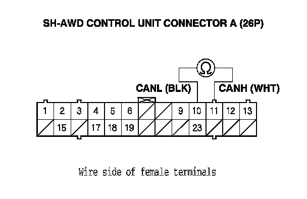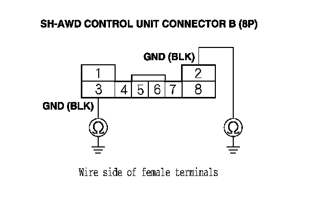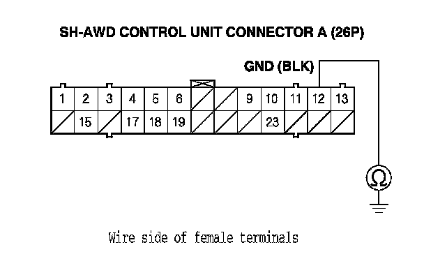 15. Check for continuity between body ground and SH-AWD control unit connector terminals B2 and B3 individually, and between SH-AWD control unit connector terminal A12 and body ground.