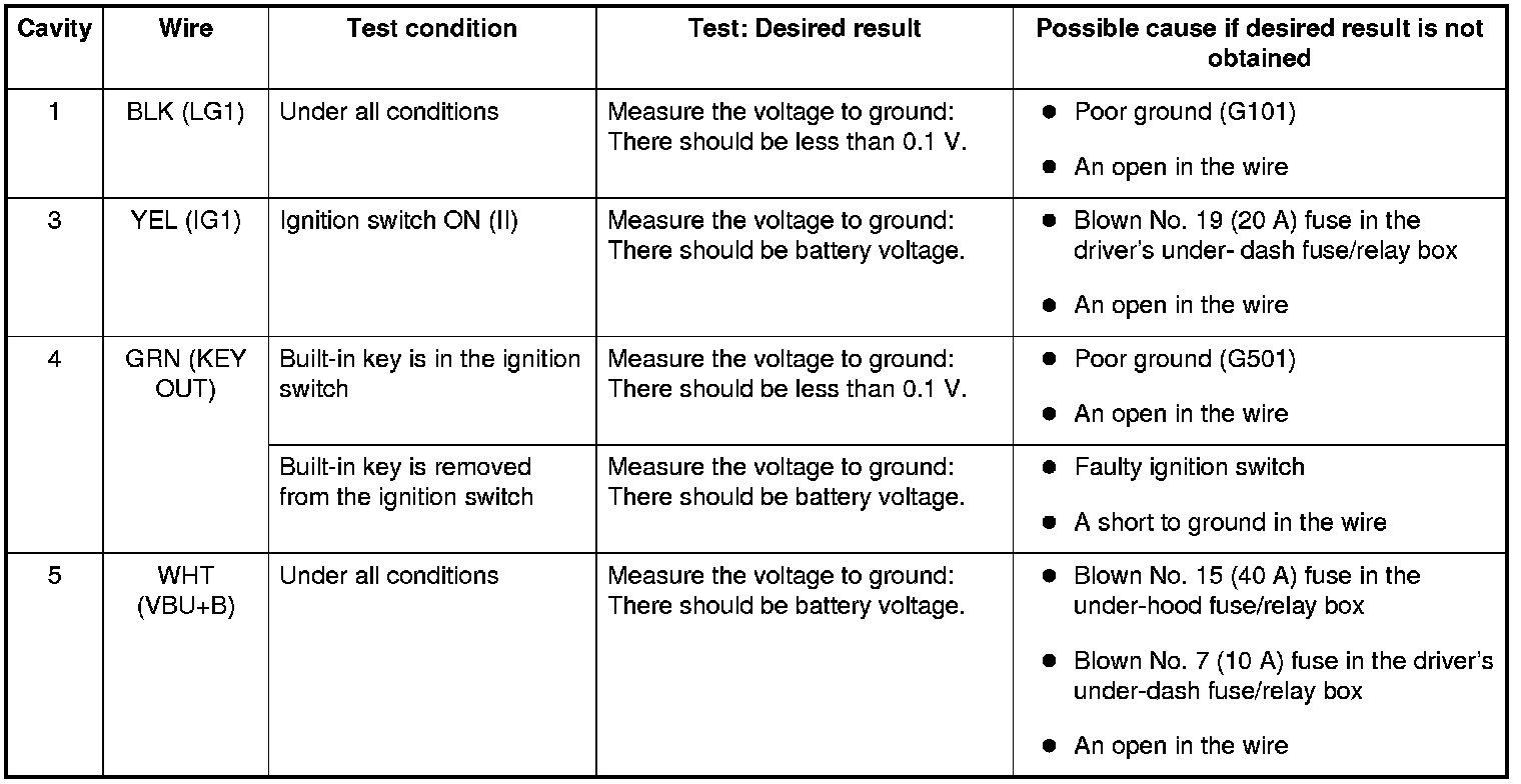 6. Reconnect the connector to the unit, turn the ignition switch to ON (II), and do these input tests at the connector.