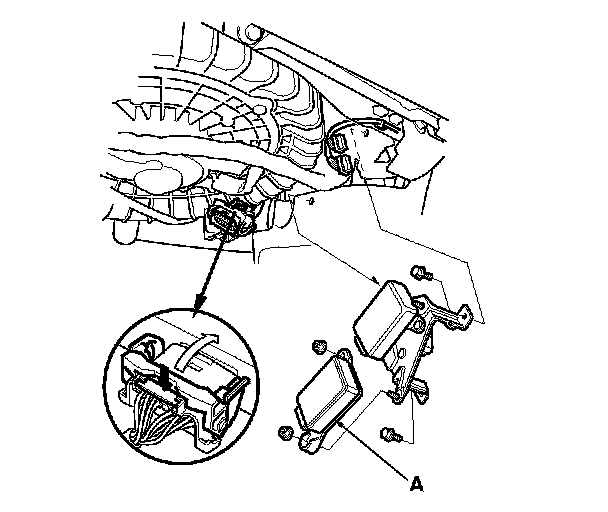 3. Remove the bolts from the bracket that holds the HandsFreeLink control unit (A), the throttle actuator control module, and the ACC unit.