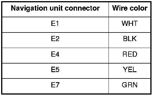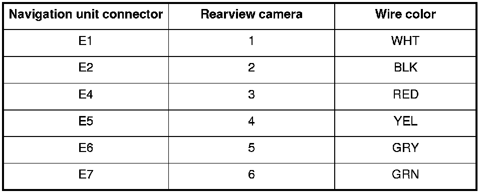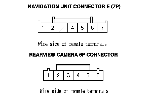 4. Check the connections between navigation unit connector E (7P) and the rearview camera 6P connector.