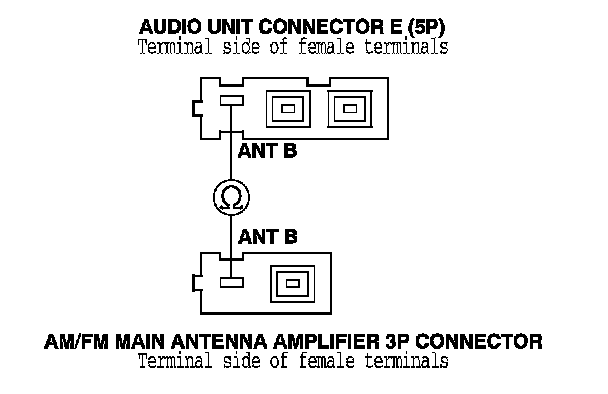 17. Check for continuity between audio unit connector E (5P) terminal No. 3 and the AM/FM main antenna amplifier 3P connector terminal No. 1.