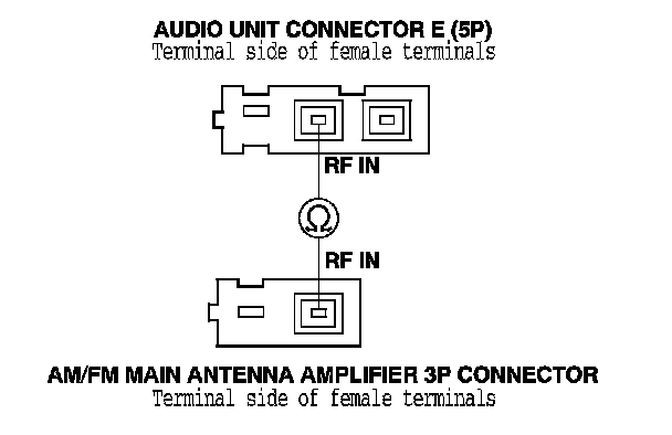 19. Check for continuity between audio unit connector E (5P) terminal No. 4 and the AM/FM main antenna amplifier 3P connector terminal No. 2.