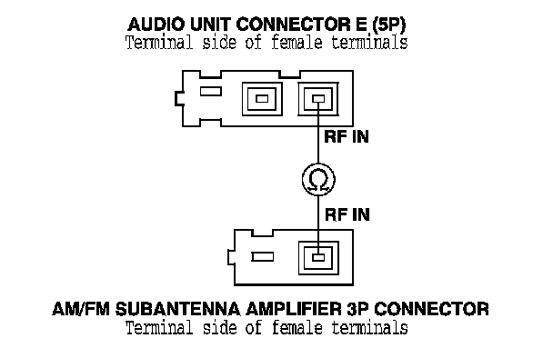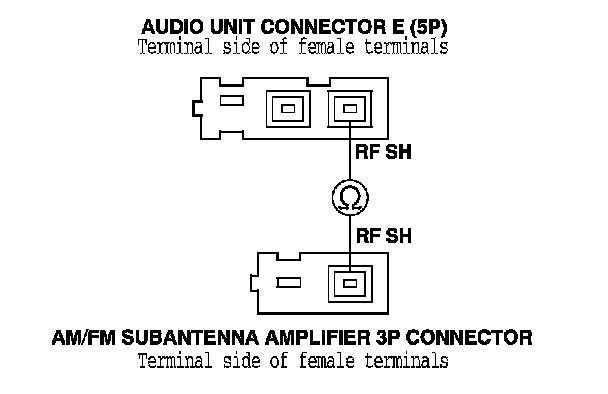 21. Check for continuity between audio unit connector E (5P) terminal No. 1 and the AM/FM subantenna amplifier 3P connector terminal No. 1.