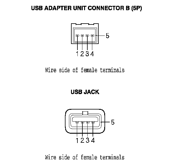 8. Check for continuity between USB adapter unit connector B (5P), and the USB jack according to the table.