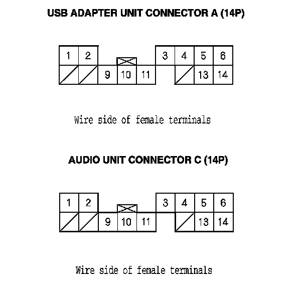 12. Check for continuity between USB adapter unit connector A (14P) and audio unit connector C (14P) according to the table.
