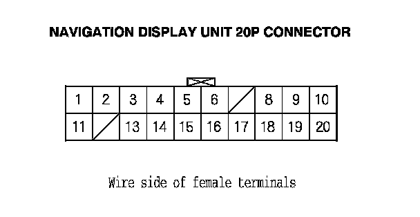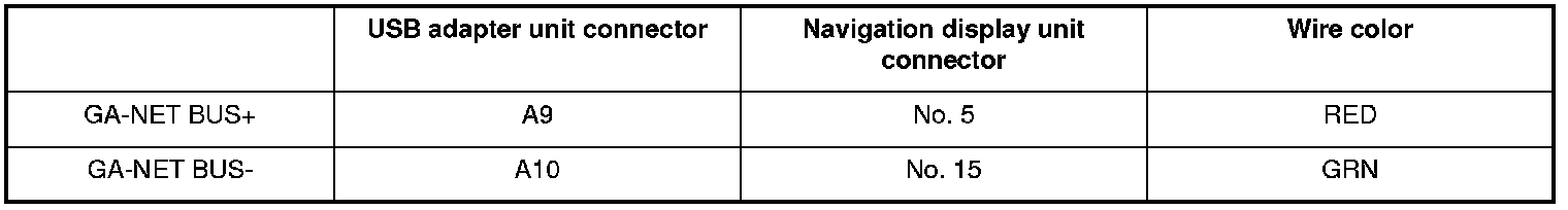 19. Check for continuity between USB adapter unit connector A (14P) and the navigation display unit 20P connector according to the table.