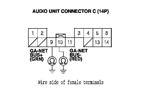 25. Check for continuity between body ground and audio unit connector C (14P) terminals No. 9 and No. 10 individually.