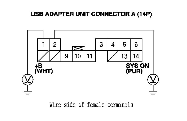 33. Measure the voltage between body ground and USB adapter unit connector A (14P) terminals No. 1 and No. 2 individually.