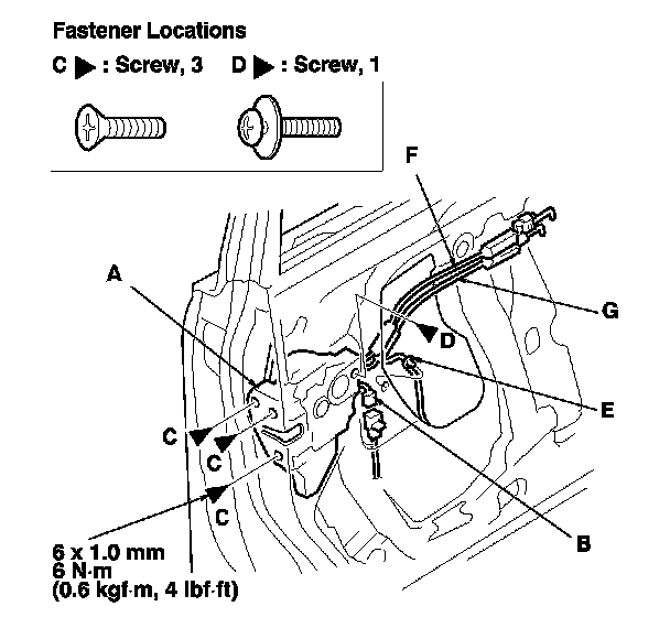 Pass the lock cable (F) and the inner handle cable (G) through the space between the door and the wire harness, then remove the latch through the hole in the door. Take care not to kink the cables.
