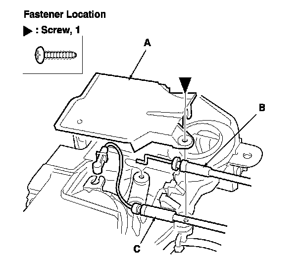 9. Remove the screw, and remove the latch protector (A), then disconnect the latch cable (B) and the inner handle cable (C).