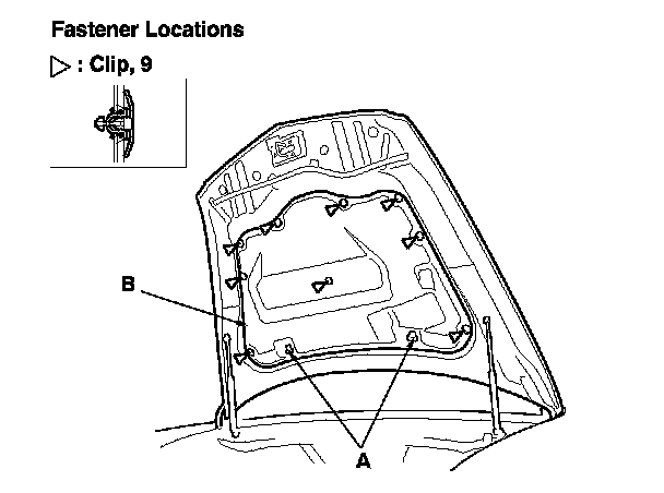 1. Using a clip remover, detach the clips. Release the hooks (A), then remove the hood insulator (B). Take care not to scratch the hood.