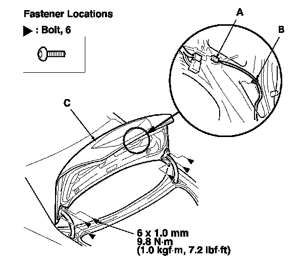 2. Disconnect the trunk lid harness connector (A), then detach the clip (B). Using a TORX T30 bit, remove the bolts, then remove the trunk lid (C), and pull the trunk lid harness out through the trunk lid.