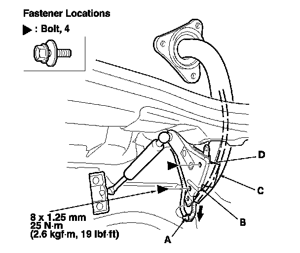 3. Detach the harness clip (A) from the right trunk hinge arm. From both sides, remove the bolts, and release the hook (B), then remove the trunk hinge arm (C) from the trunk lid hinge (D).