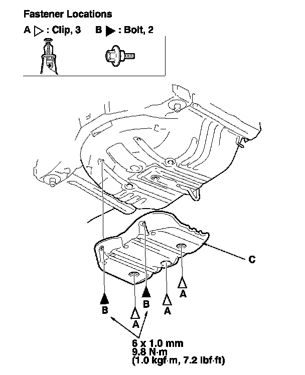 1. Remove the clips (A) and the bolts (B), then remove the rear undercarriage cover (C). Take care not to scratch the rear bumper.