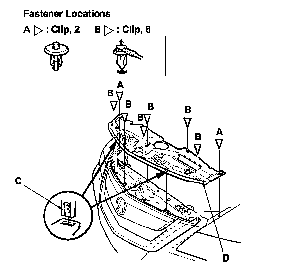 2. Detach the clips (A, B). Using a trim tool, detach the clip (C), then remove the upper grille cover (D).