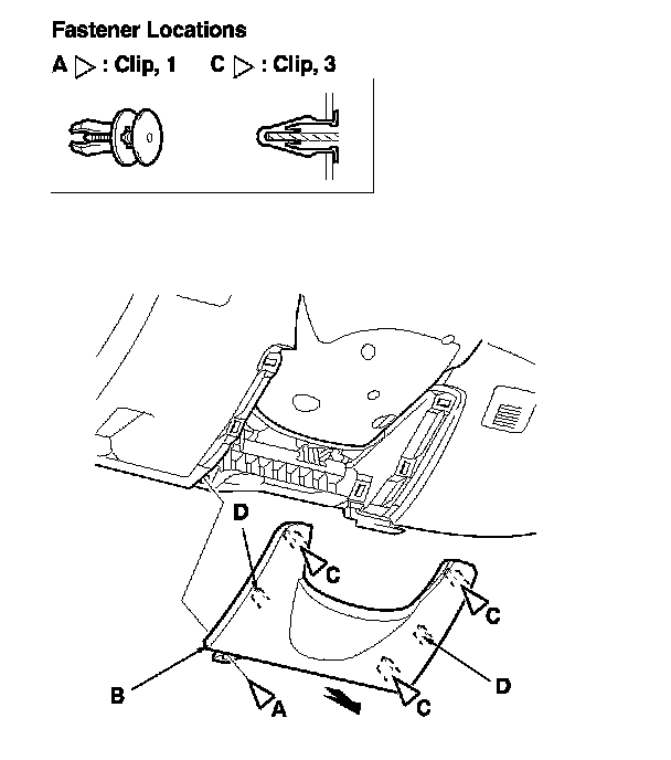 3. Release the clip (A), and pull out the driver's dashboard lower cover (B) to detach the clips (C) and hooks (D), then remove the cover.