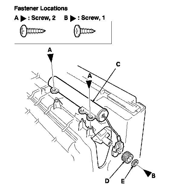 2. Remove the screws (A, B), then remove the glove box damper (C), the stopper rubber (D), and the washer (E).