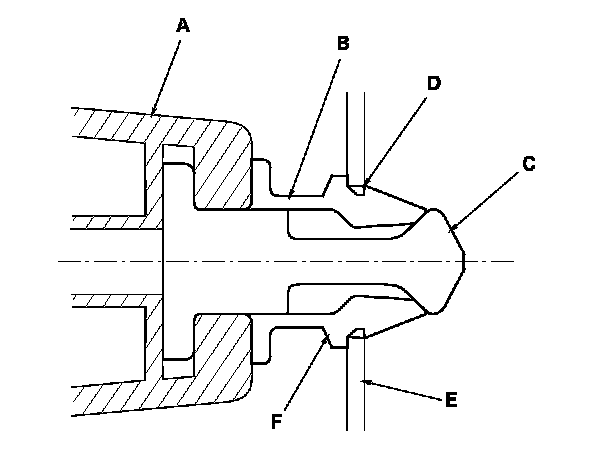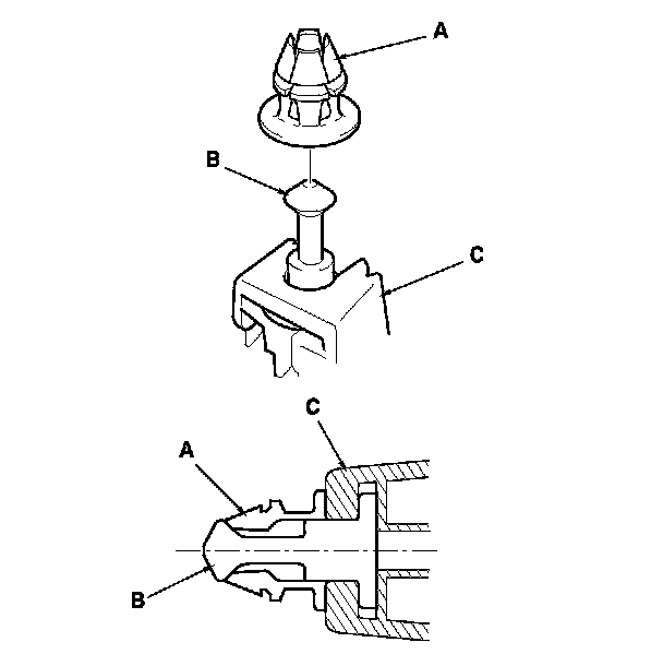 - The upper clip in the A-pillar trim (A) consists of a plastic grommet (B) and a metal pin (C). The groove (D) in the grommet secures it to the body panel (E). The shoulder (F) on the grommet is broken during removal, so the grommet must be replaced with a new one when the trim is reinstalled.