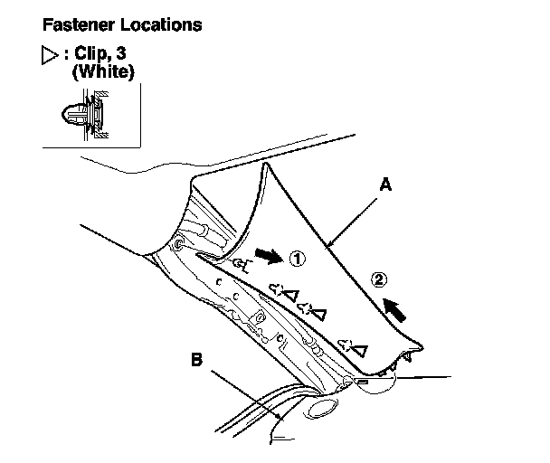 4. Remove the A-pillar trim (A) by hand to detach the remaining clips, then pull the trim up from the dashboard (B).