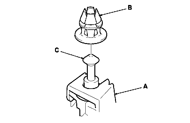 10. Carefully reinstall the grommet (A) on the pin (B) and seat them on the A-pillar trim (C) as shown.