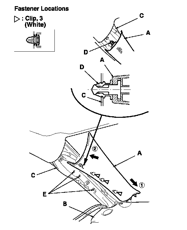 Place the trim over the A-pillar (C), and fit its upper clip (D) and the other clips into holes (E) in the A-pillar, then lightly push the trim into place.