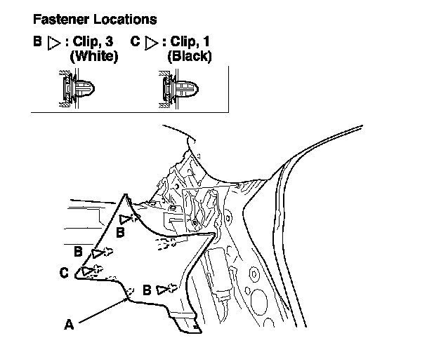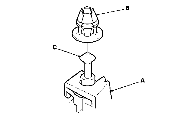 11. Carefully reinstall the grommet (A) on the pin (B) and seat them on the C-pillar trim (C) as shown.
