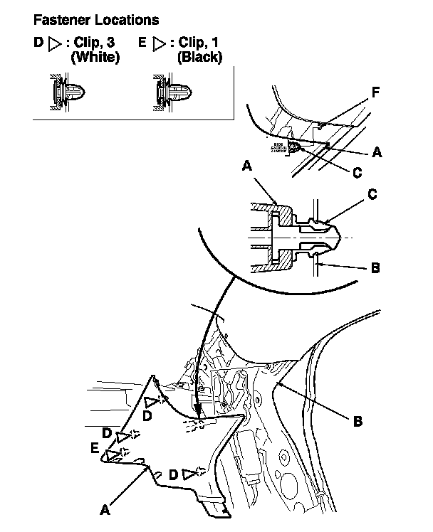 - The upper clip in the C-pillar trim (A) consists of a plastic grommet (B) and a metal pin (C). The groove (D) in the grommet secures it to the body panel (E). The shoulder (F) on the grommet is broken during removal, so the grommet must be replaced with a new one when the trim is reinstalled.