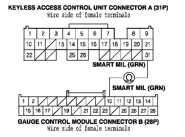 10. Check for continuity between keyless access control unit connector A (31P) terminal No. 31 and gauge control module connector B (28P) terminal No. 10.