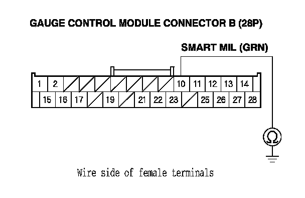 12. Connect an ohmmeter between gauge control module connector B (28P) terminal No. 10 and body ground.