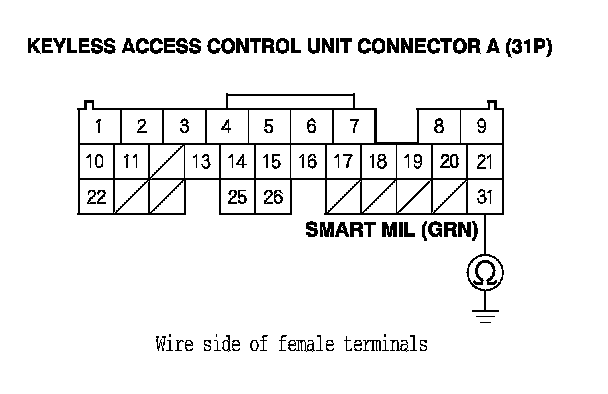 22. Check for continuity between the keyless access control unit connector A (31P) terminal No. 31 and body ground.