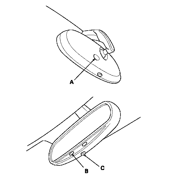 The automatic dimming inside mirror has a front-facing lux level sensor (A), a rear-facing lux level sensor (B), and a control unit. The control unit receives signals from each sensor. Based on the difference between the two lux levels (the light outside the vehicle and the light from the headlights of the other vehicle, etc.), the control unit controls the electro-chromic gel to reduce the glare. This dimming function is canceled when the transmission is in reverse, or when the automatic dimming off switch (C) is turned OFF.