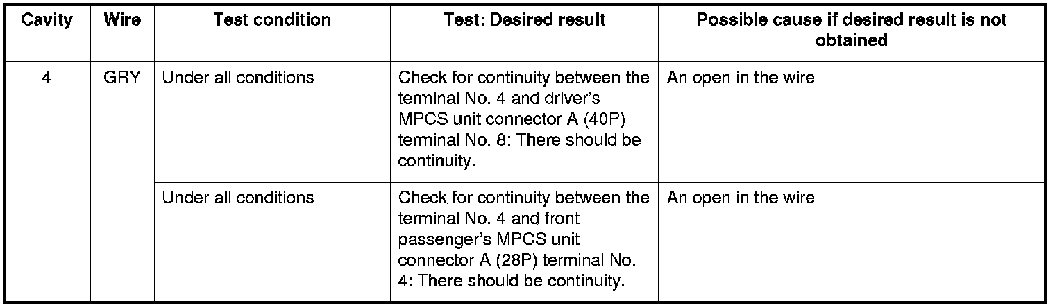 7. If all the input tests are OK and multiple failures are found, replace the moonroof motor assembly. If the problem is related to the key-off operation, go to the driver's MPCS unit input test, Keyless/Power Door Locks/Security System Control Unit Input Test and front passenger's MPCS unit input test. Keyless/Power Door Locks/Security System Control Unit Input Test