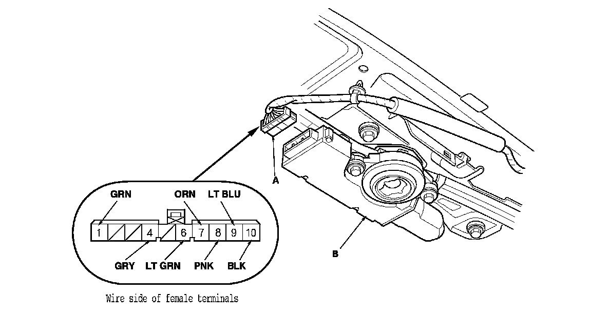 3. Disconnect the 10P connector (A) from the moonroof control unit (B).